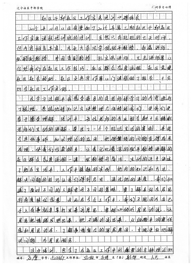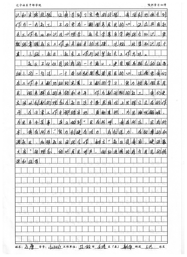 辽阳市白塔区新华街道人兴社区副书记石雪培训学习心得