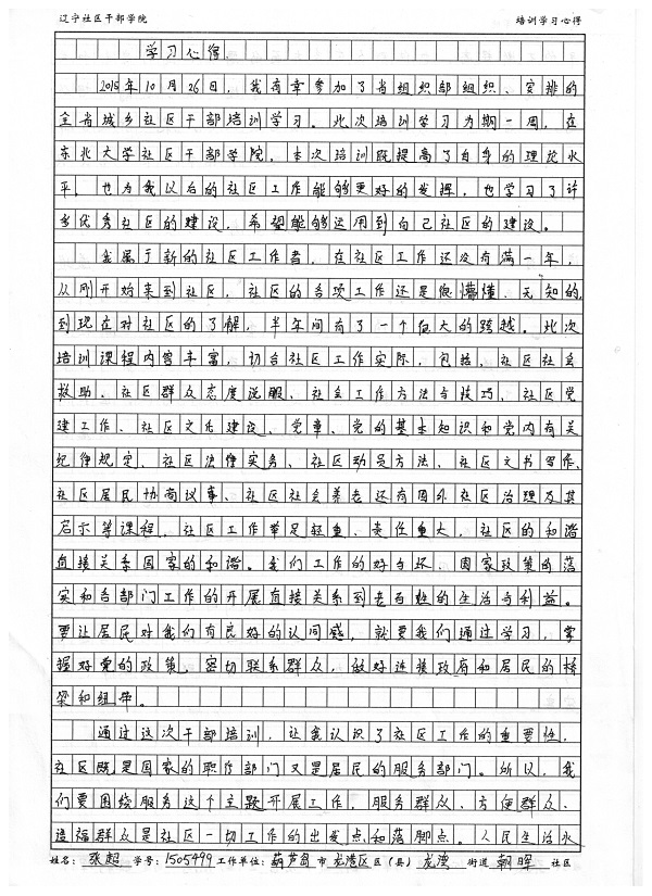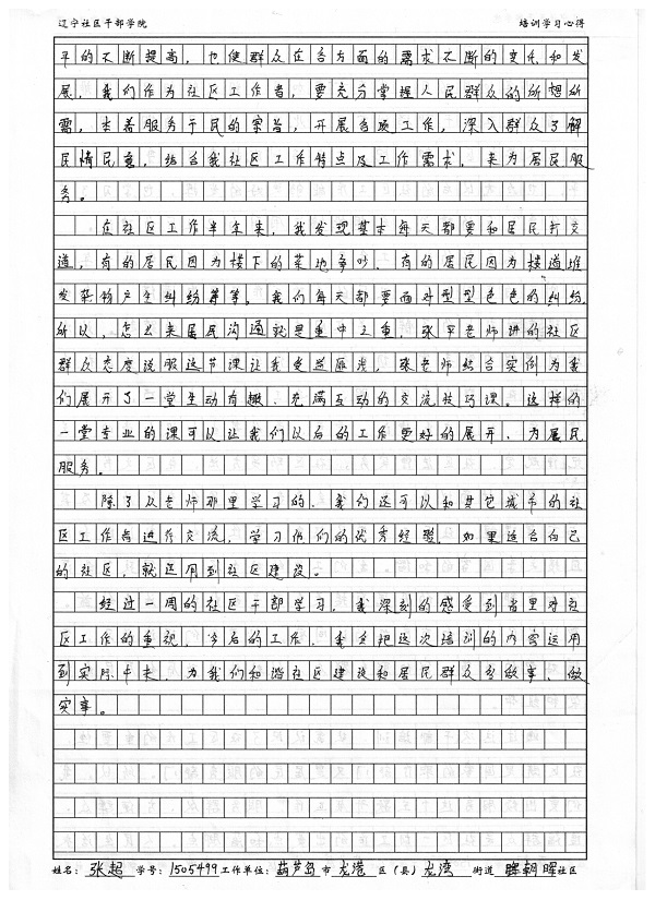 葫芦岛市龙港区龙湾街道朝晖社区委员张超培训学习心得