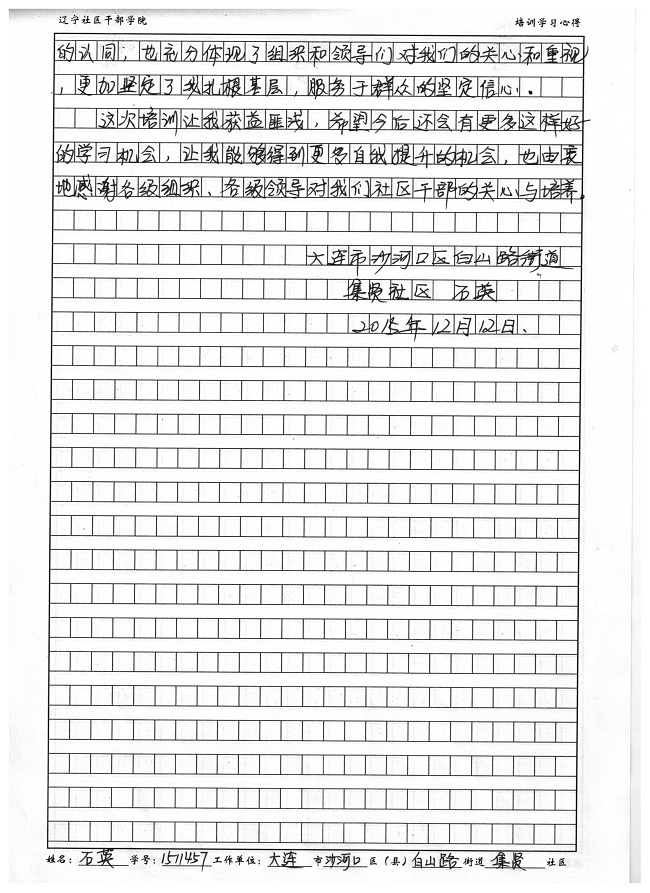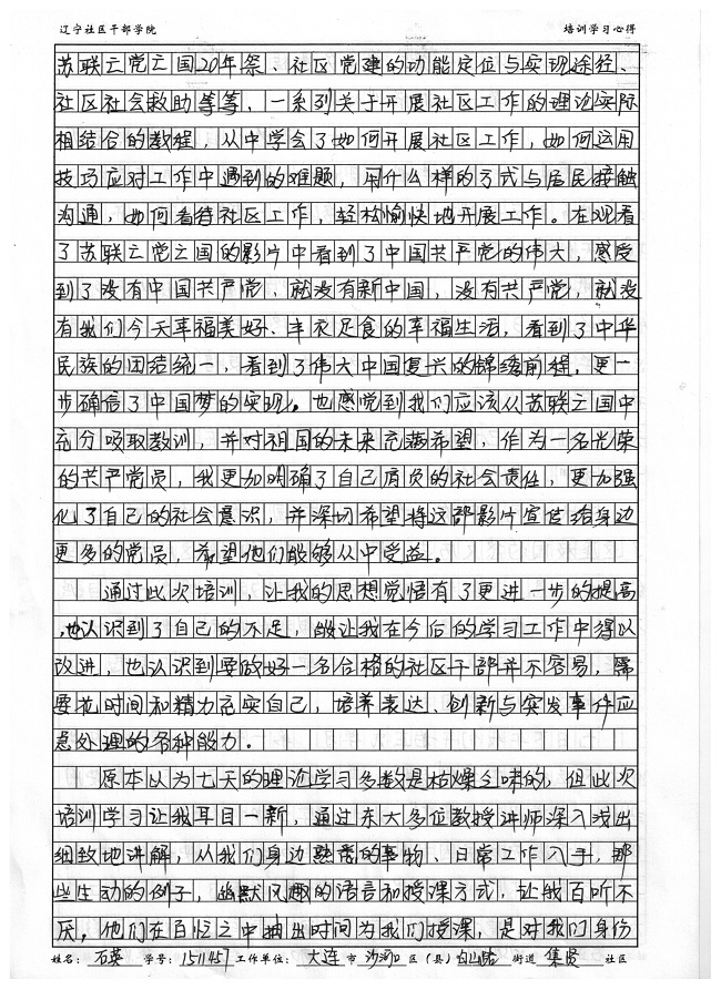 大连市沙河口区白山路集贤社区副书记石英培训心得