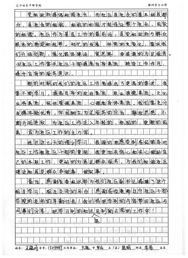 大连市中山区昆明街道华昌社区副书记王晓丹培训学习心得