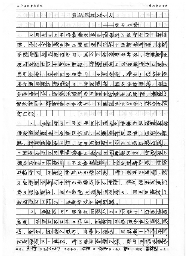 沈阳市铁西区重工街道富祥园社区书记王辉培训学习心得