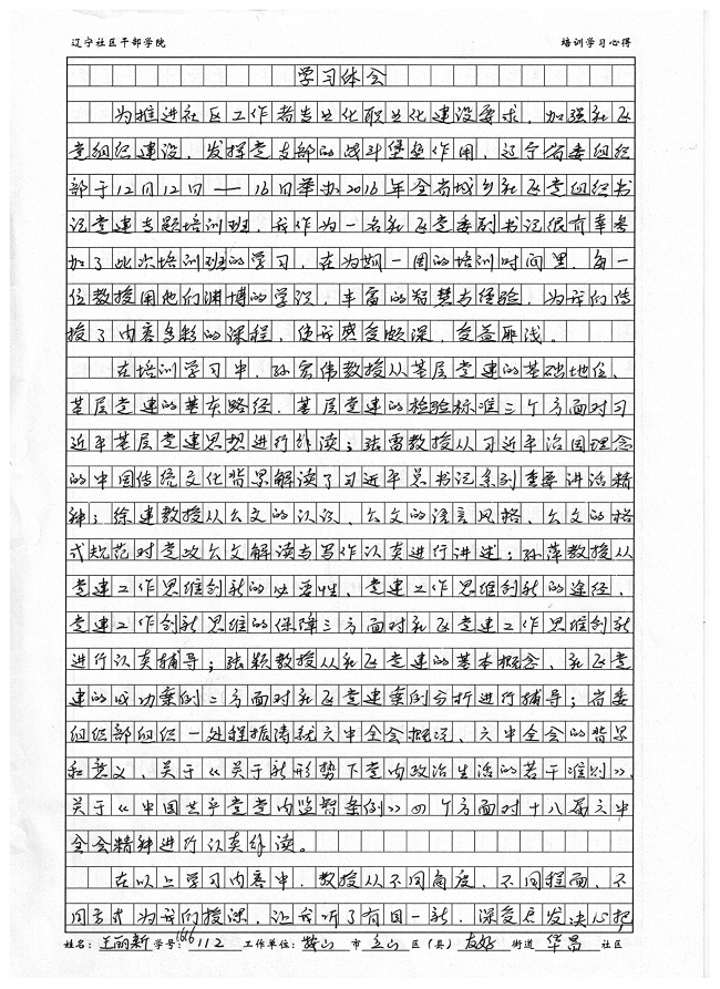 鞍山市立山区友好街道华昌社区王立新培训学习心得扫描