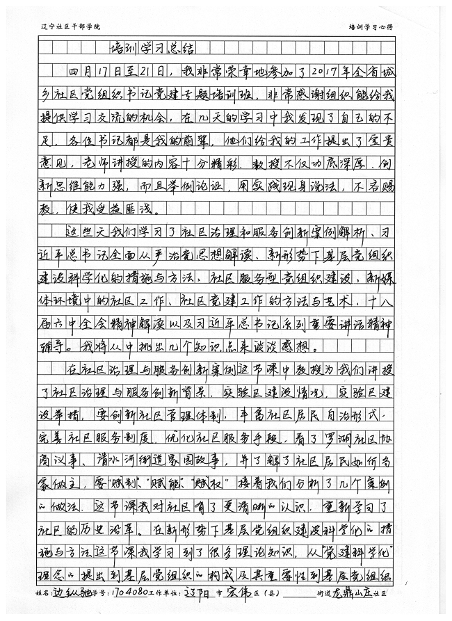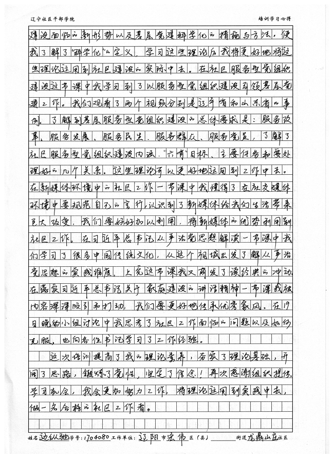 辽阳市宏伟社区龙鼎山庄街道社区书记边纵驰培训心得
