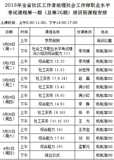 2018年社区工作者助理社会工作师考前辅导第一期(总第26期)培训班课程安排