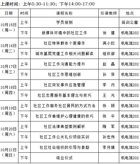 2018年社区工作者社区工作实务第六期(总第50期)培训班课程安排