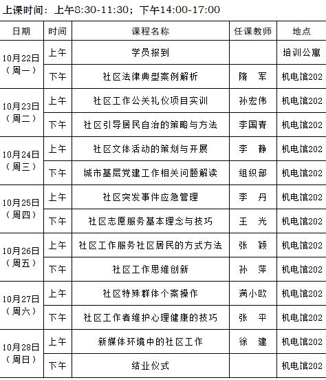 2018年社区工作者社区工作实务第七期(总第51期)培训班课程安排