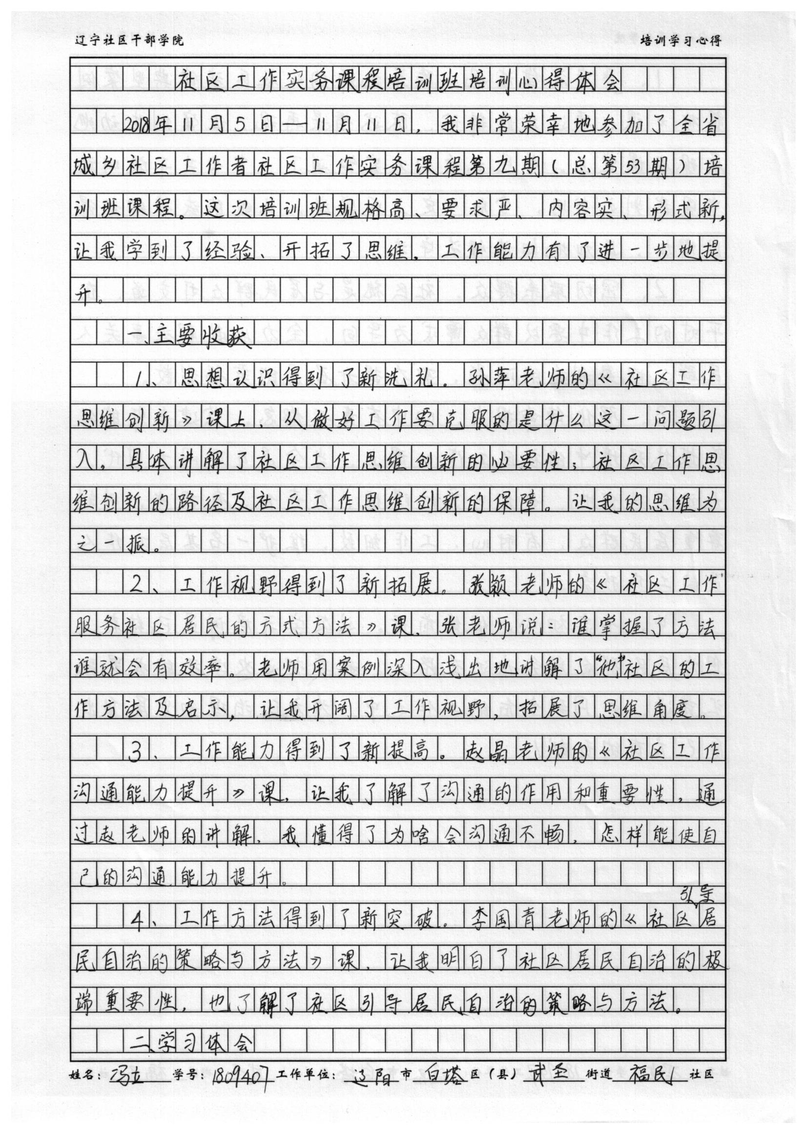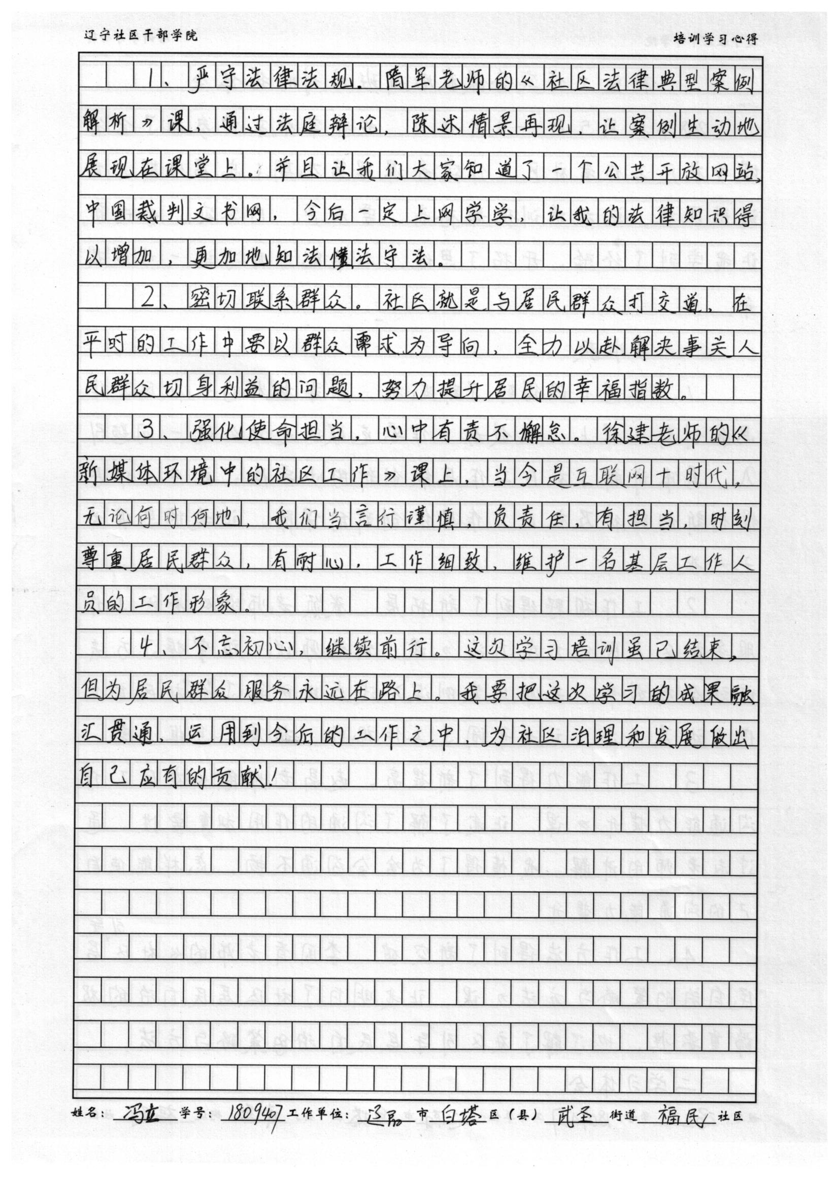 辽阳市白塔区武圣街道福民社区副主任冯立培训心得