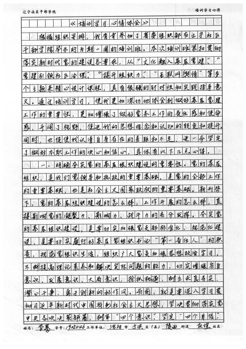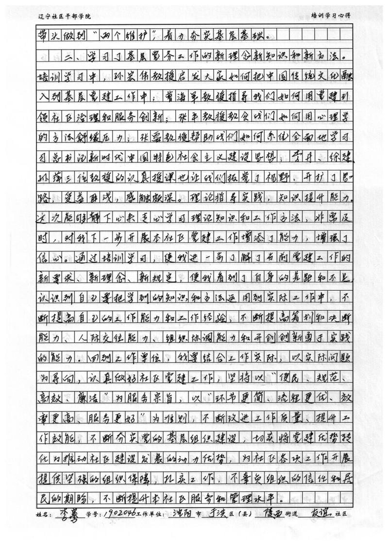 沈阳市于洪区陵西街道友谊社区书记李骞培训心得