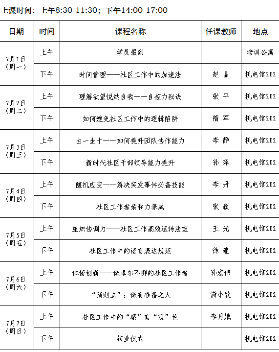 2019年全省城乡社区工作者素质能力提升专题培训班第二期(总59期)培训班课程安排
