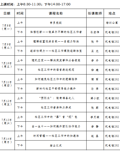 2019年全省城乡社区工作者素质能力提升专题培训班第三期(总60期)培训班课程安排