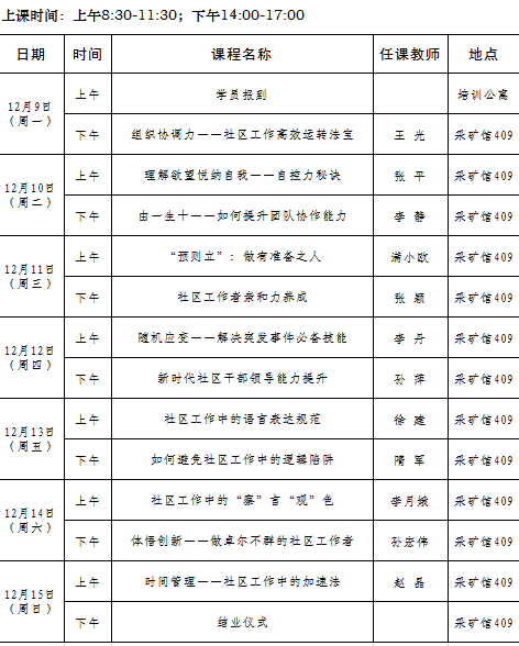 2019年全省城乡社区工作者素质能力提升专题培训班第十三期(总第70期)课程安排