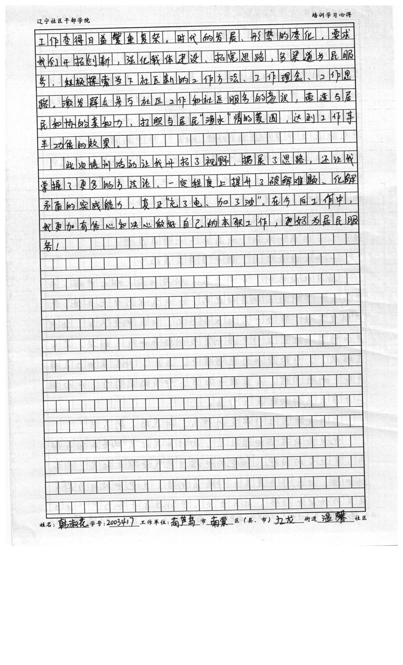葫芦岛市南票市九龙街道温馨社区副书记韩淑花学习心得