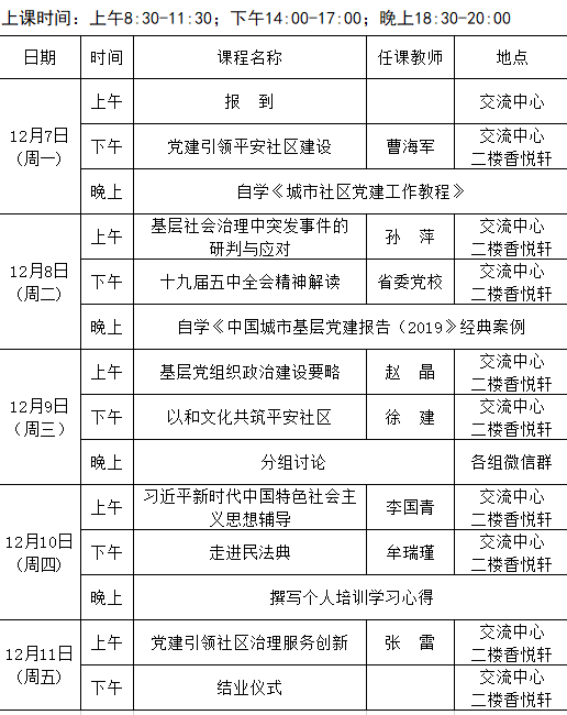 2020年全省城乡社区党组织书记党建引领平安社区建设专题第十期(总99期)培训班课程安排