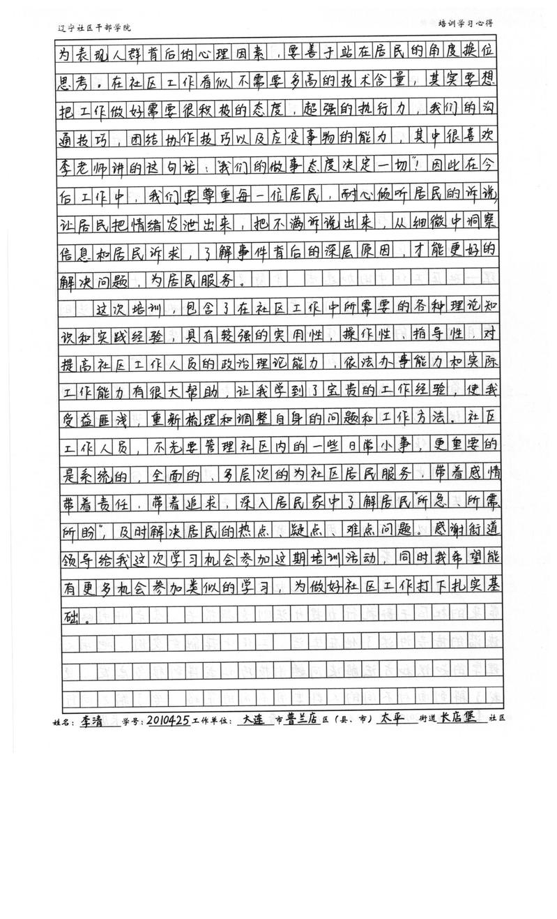 大连市普兰店区太平街道长店堡社区李清心得