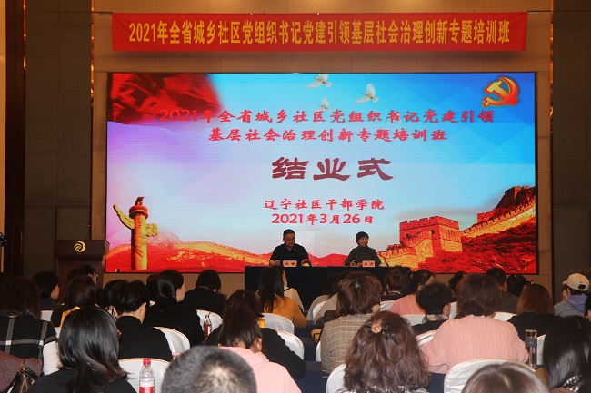 3月26日10:30,2021年全省城乡社区党组织书记党建引领基层社会治理创新专题培训班第一期(总101期)培训班结业仪式在东北大学国际学术交流中心二楼宴会厅举行,辽宁社区干部学院办公中心主任、东北大学文法学院副院长李丹同志,辽宁社区干部学院培训部主任赵璇同志参加了本次结业仪式,仪式由赵璇主持。
