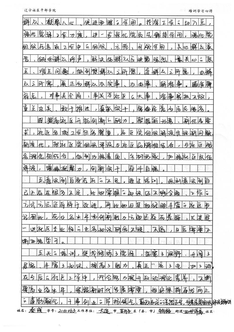 大连市甘井子区中华路街道加州洋房社区书记秦彧培训学习心得