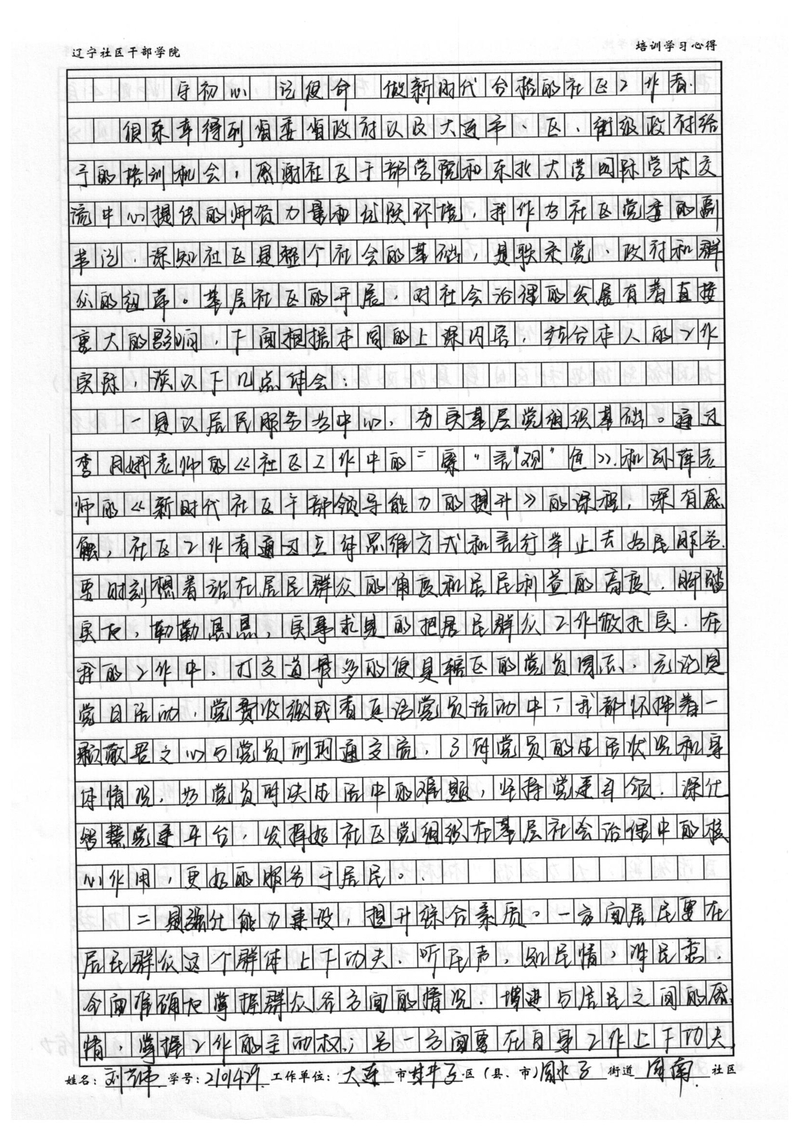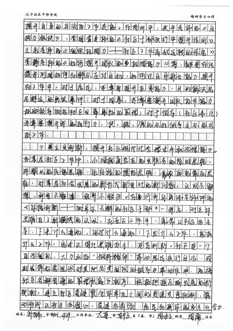 大连市甘井子区周水子街道周南社区副书记刘艺伟培训学习心得