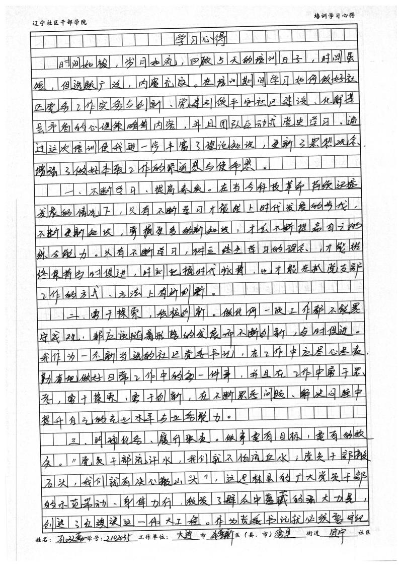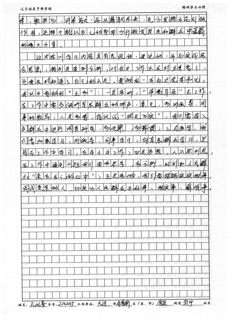 大连金普新区湾里街道宜宁社区书记孔双喜培训学习心得