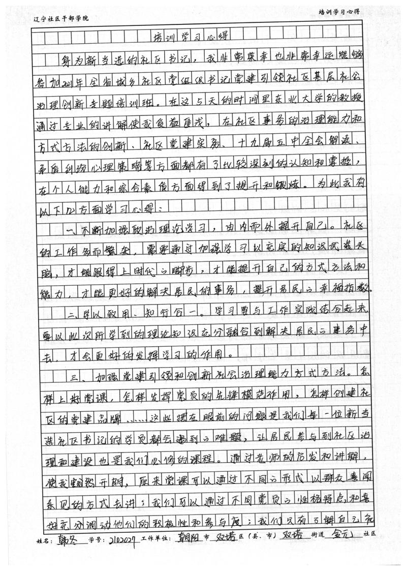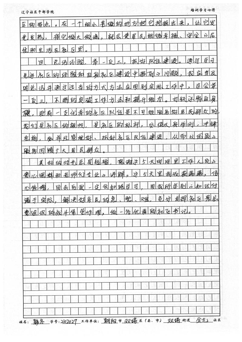 朝阳市双塔区双塔街道金元社区书记韩冬培训学习心得