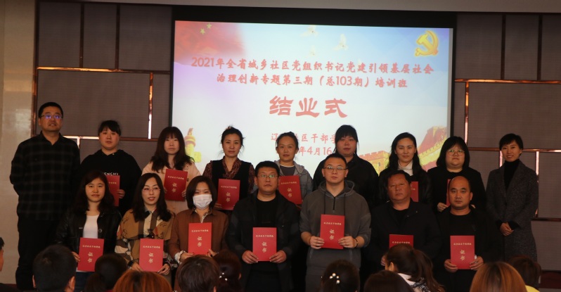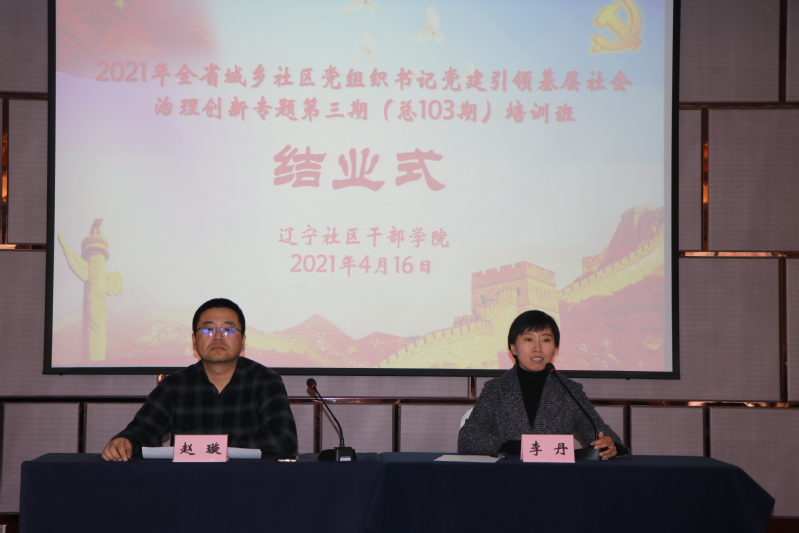 4月16日10:30,2021年全省城乡社区党组织书记党建引领基层社会治理创新专题培训班第三期(总103期)培训班结业仪式在东北大学国际学术交流中心二楼宴会厅举行,辽宁社区干部学院办公中心主任、东北大学文法学院副院长李丹同志,辽宁社区干部学院培训部主任赵璇同志参加了本次结业仪式,仪式由赵璇主持。