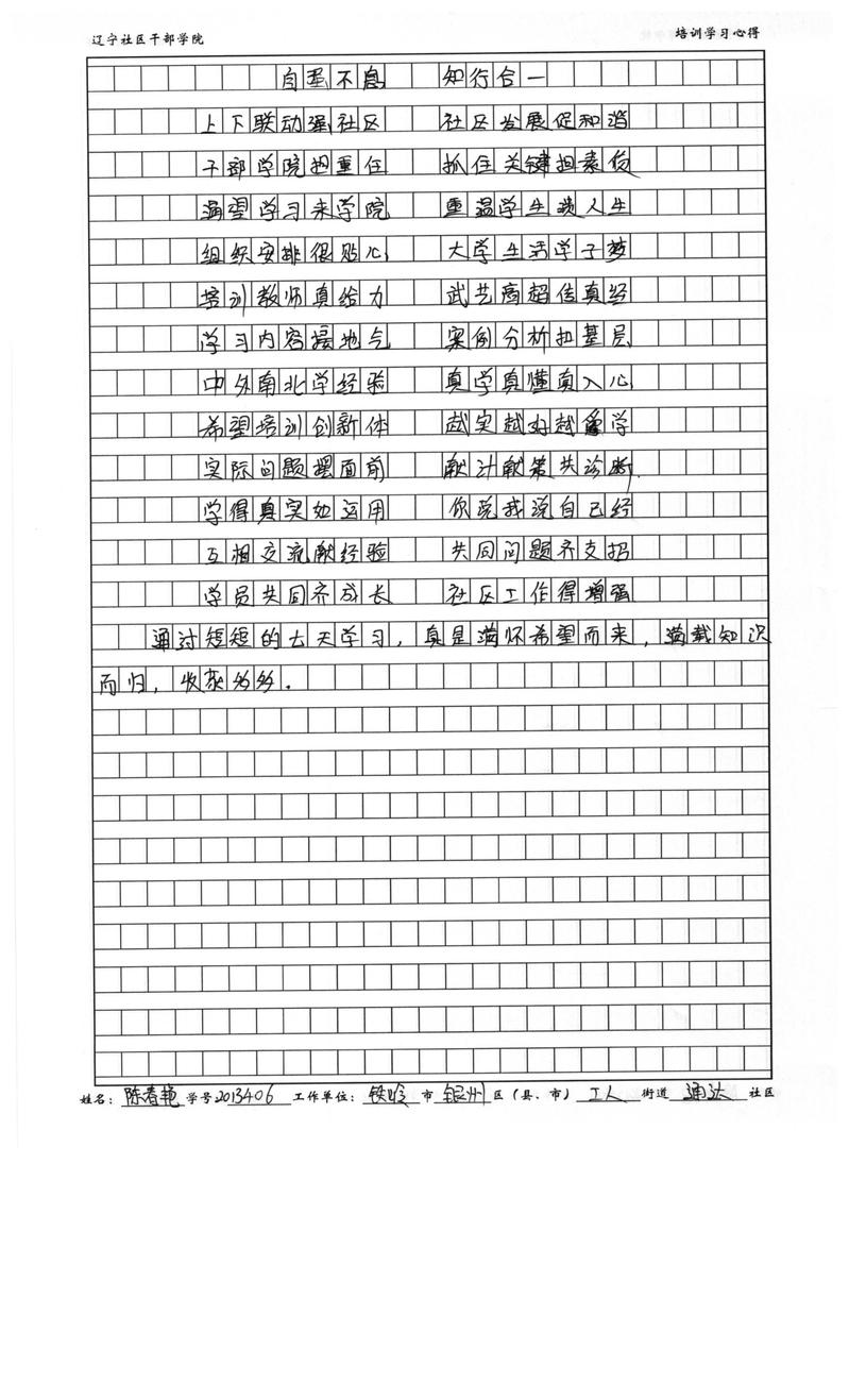 铁岭市银州区工人街道通达社区副书记陈春艳培训学习心得