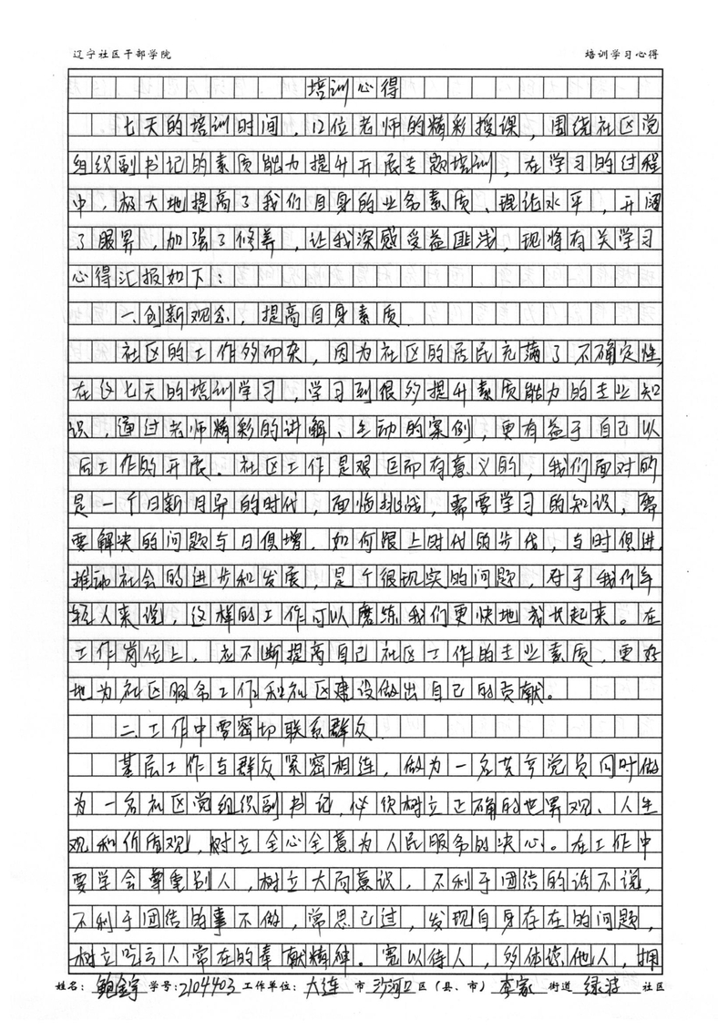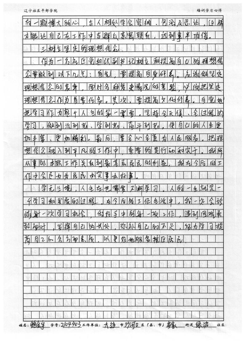 大连市沙河口区李家街道绿波社区副书记鲍金宇培训心得