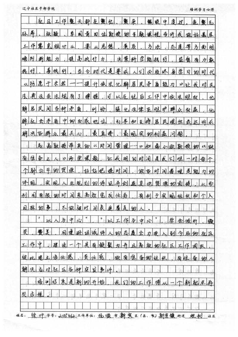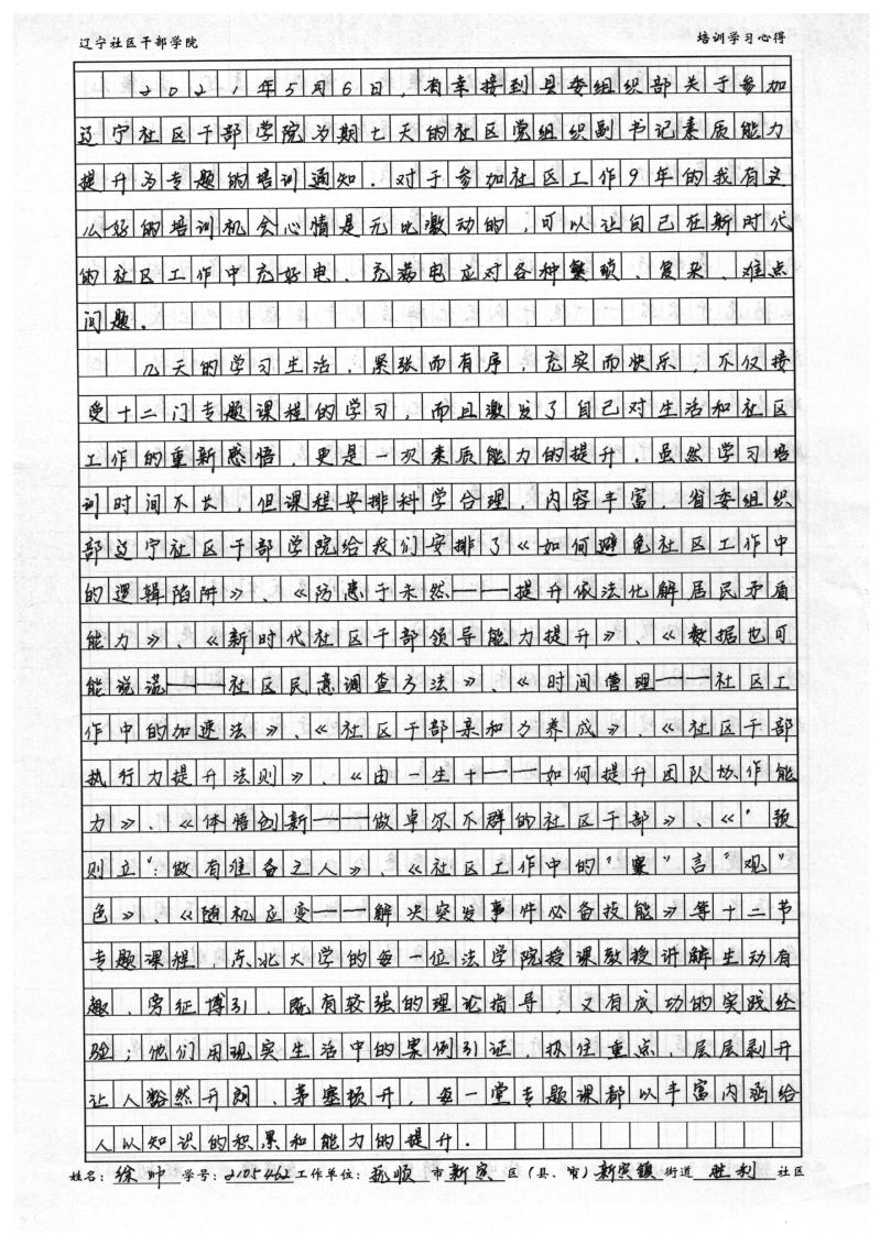 抚顺市新宾县新宾镇胜利社区副书记徐帅培训学习心得