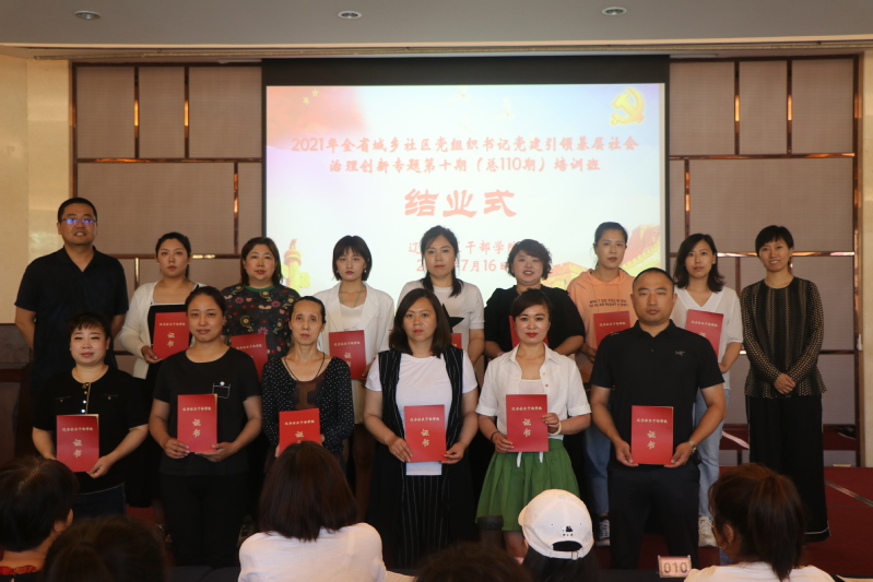 7月16日10:30,2021年全省城乡社区党组织书记党建引领基层社会治理创新专题培训班第十期(总110期)培训班结业仪式在东北大学国际学术交流中心二楼香悦轩举行,辽宁社区干部学院办公中心主任、东北大学文法学院副院长李丹同志,辽宁社区干部学院培训部主任赵璇同志参加了本次结业仪式,仪式由赵璇同志主持。