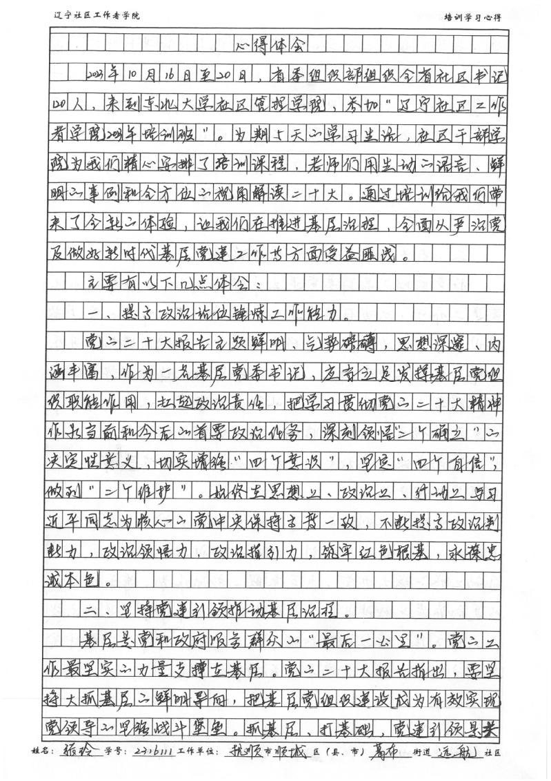 抚顺市顺城区葛布街道远航社区党委书记张玲心得体会
