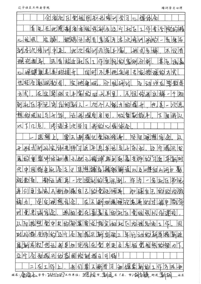 沈阳市新民市胡台镇新胡社区党支部书记、居委会主任金海玉学习心得