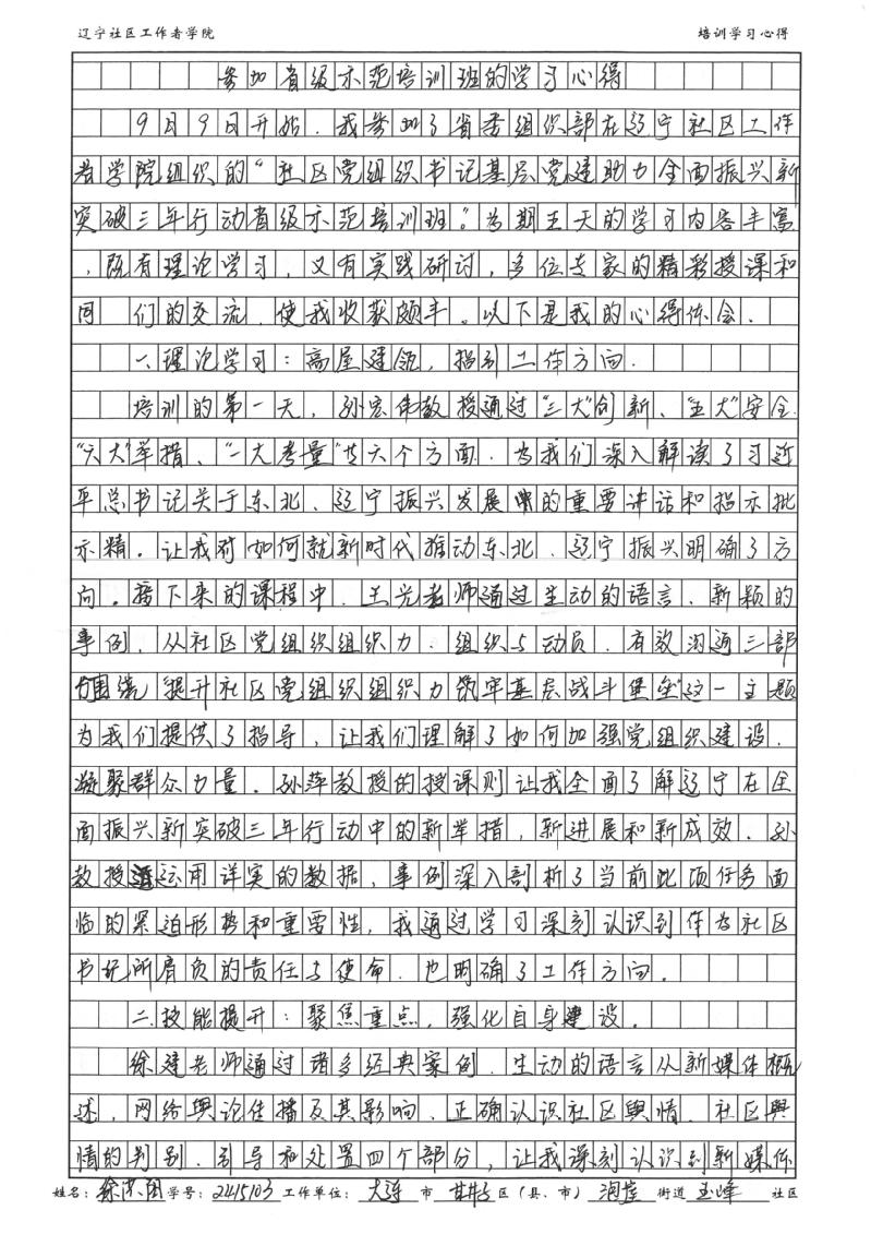 大连市甘井子区泡崖街道玉峰社区党委书记、居委会主任徐洪阳学习心得