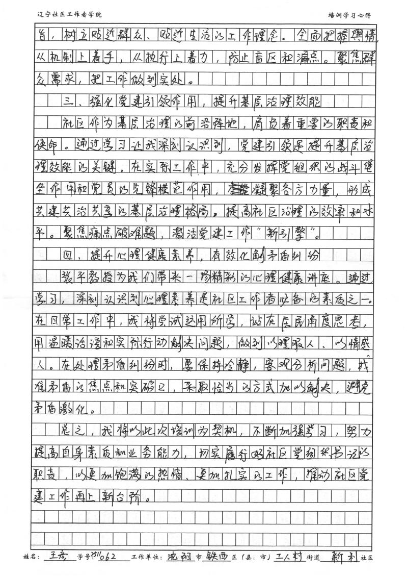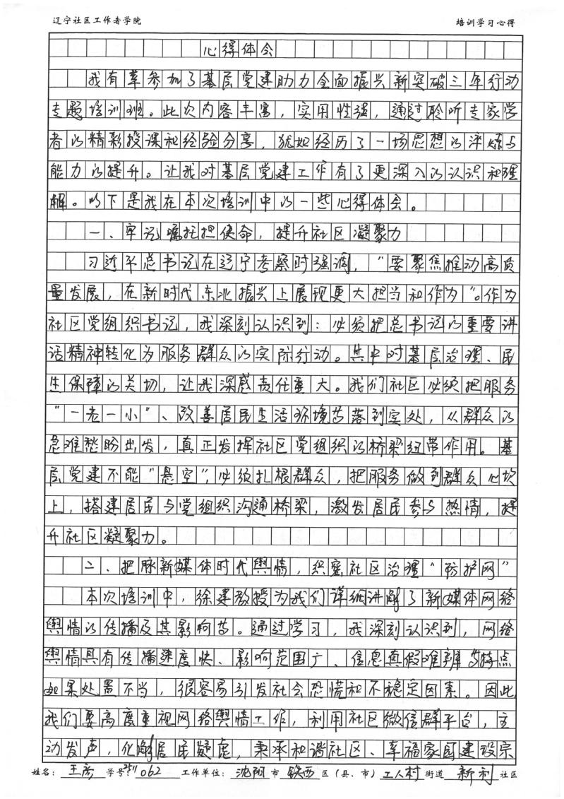 沈阳市铁西区工人村街道新利社区党委书记、居委会主任王彦学习心得