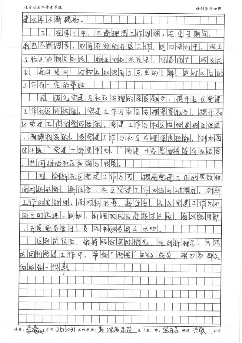 省沈抚示范区深井子街道兴联社区党总支书记、居委会主任李春四学习心得